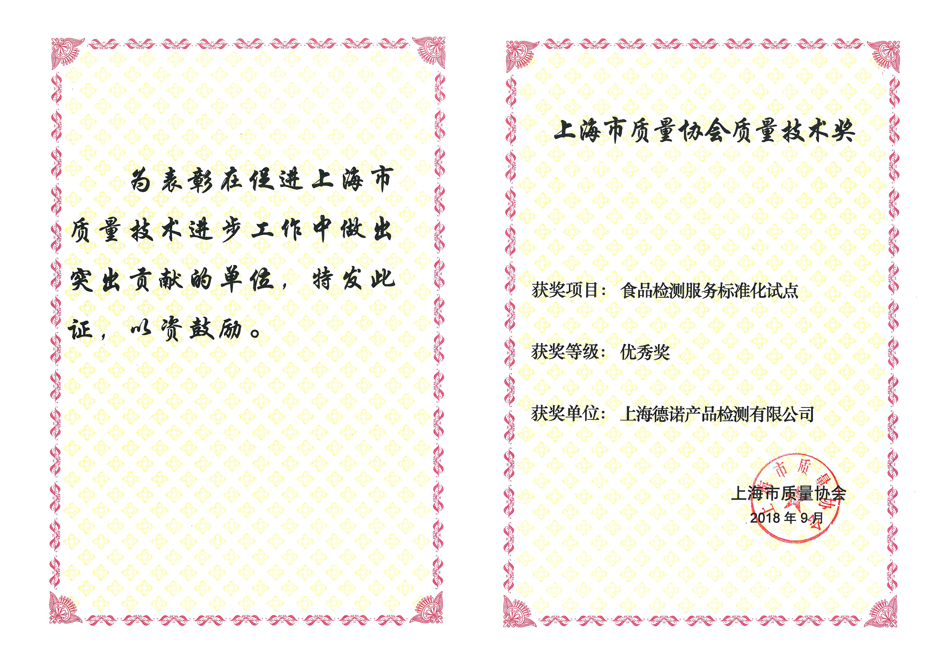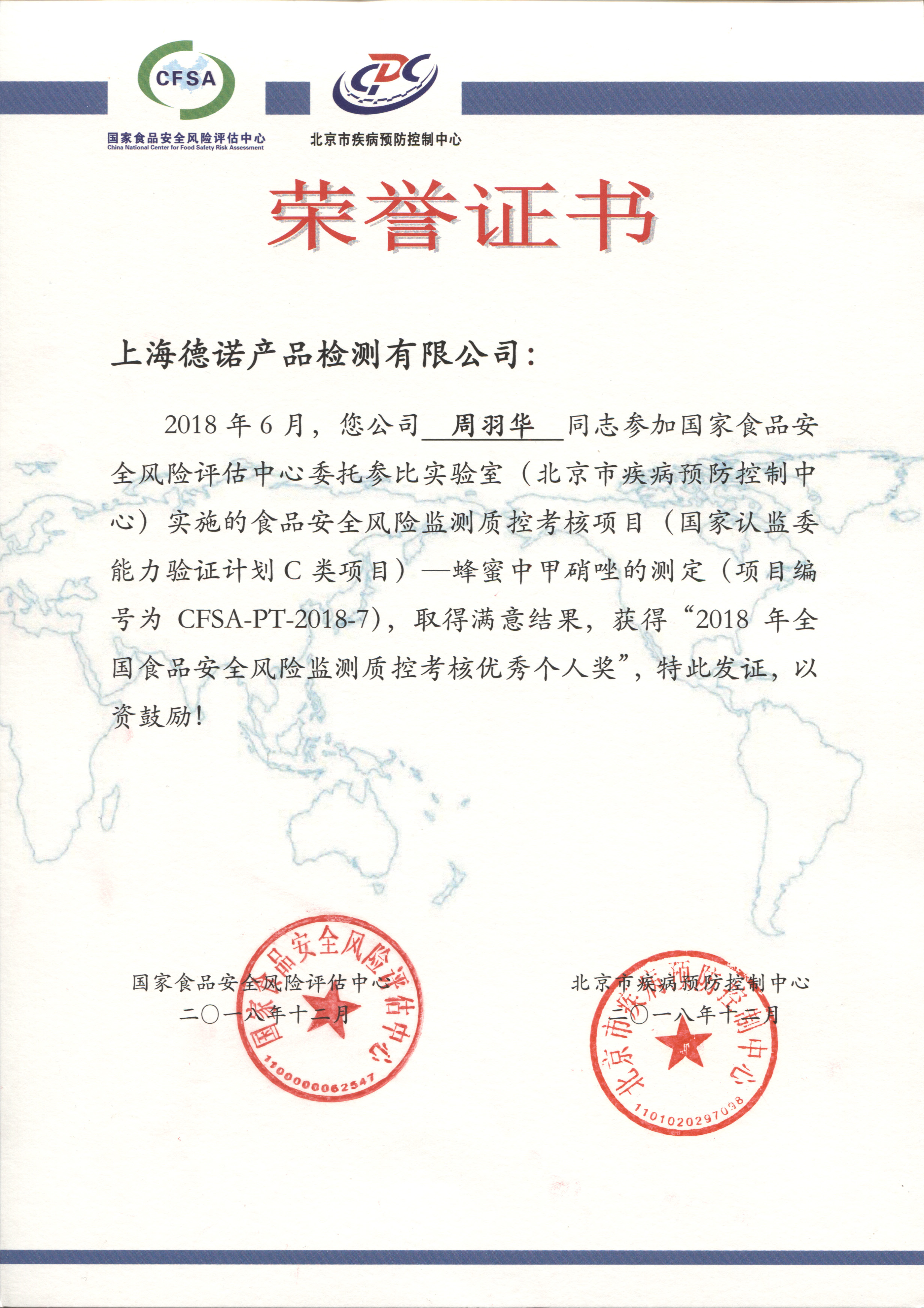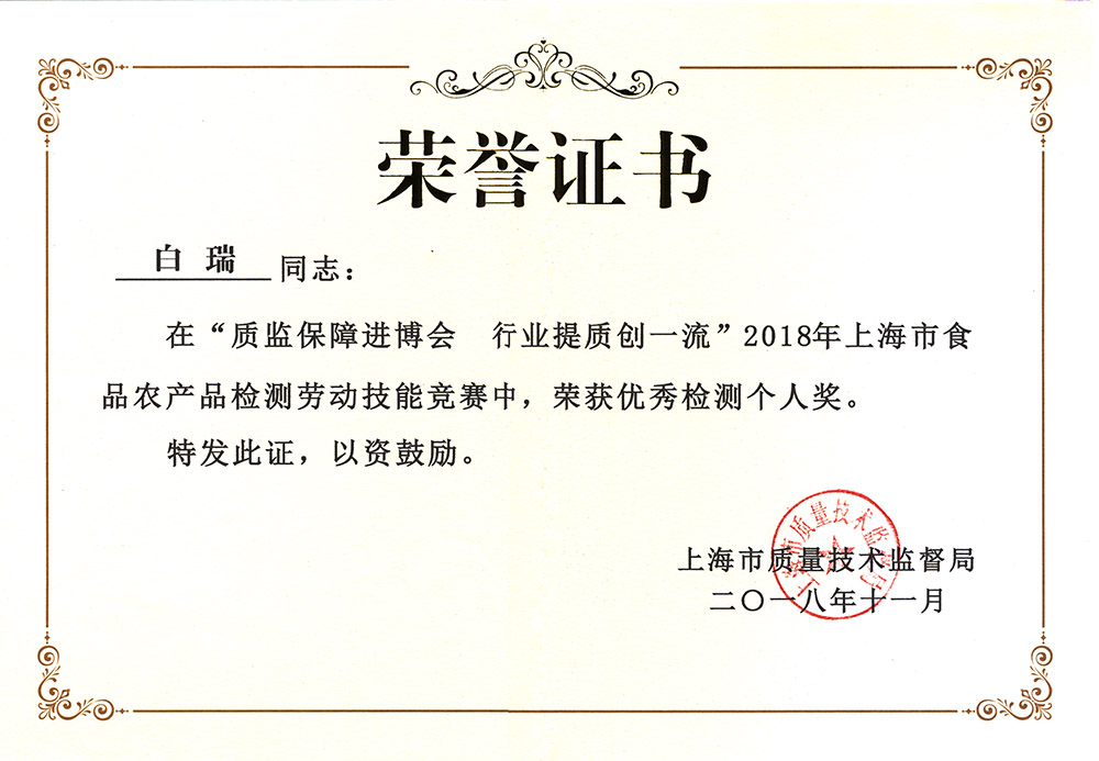 2018.11 2018年上海市食品農(nóng)產(chǎn)品檢測(cè)勞動(dòng)技能競(jìng)賽優(yōu)秀檢測(cè)個(gè)人獎(jiǎng) |