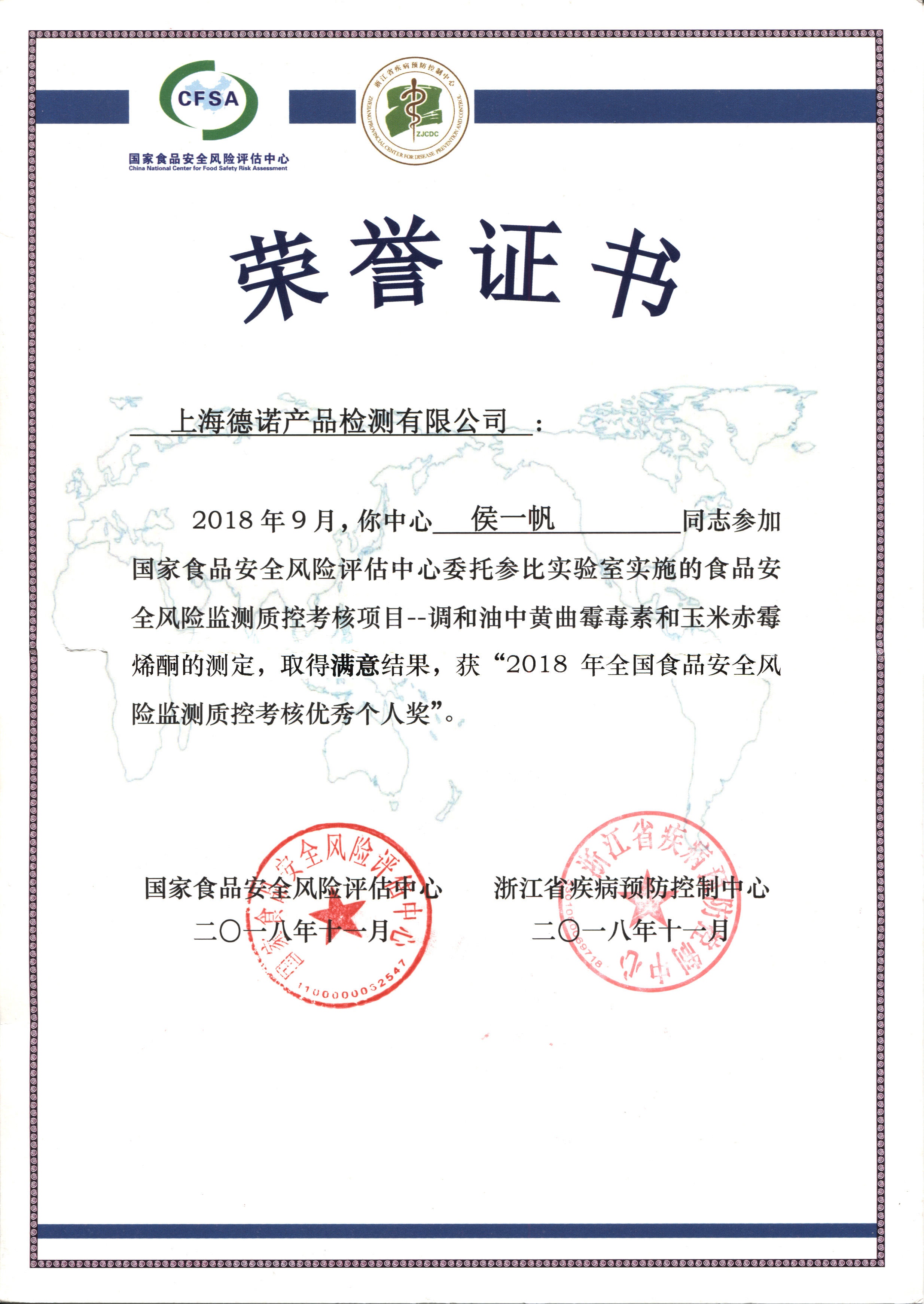 2018.11 2018年全國(guó)食品安全風(fēng)險(xiǎn)監(jiān)測(cè)質(zhì)控考核優(yōu)秀個(gè)人獎(jiǎng) |