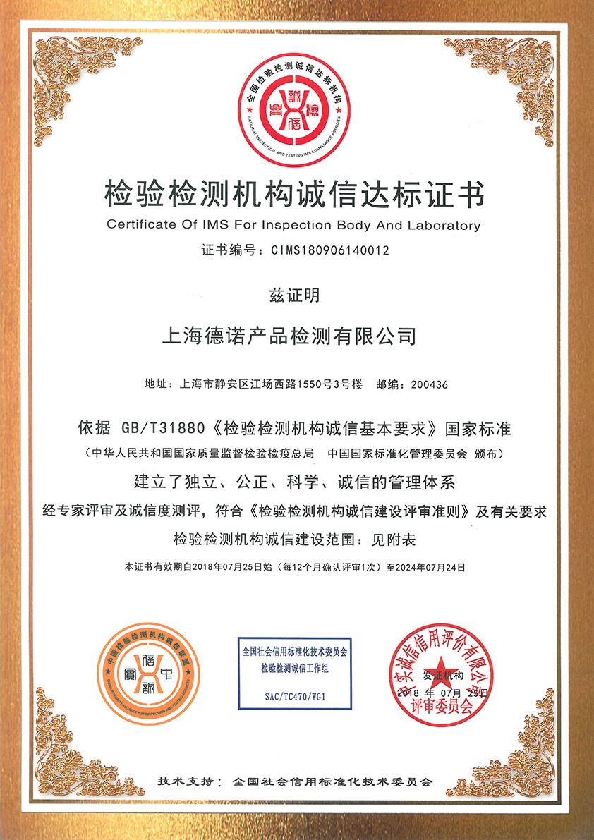 2018.7 檢驗(yàn)檢測(cè)機(jī)構(gòu)誠(chéng)信達(dá)標(biāo)證書 |